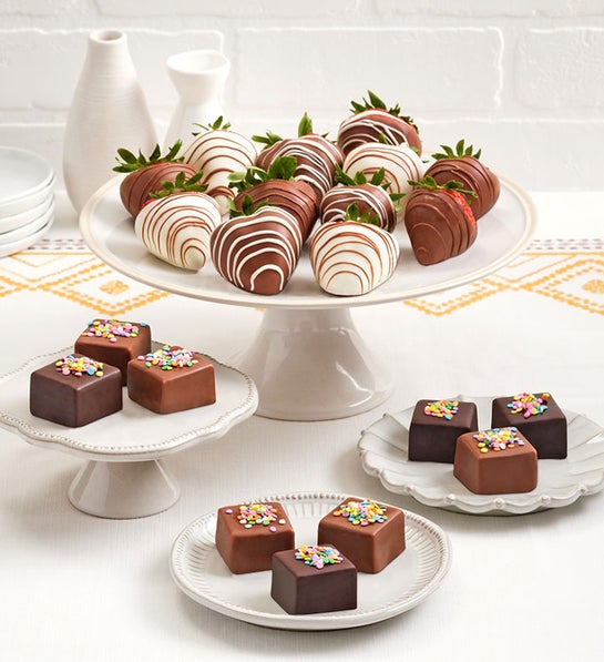 What’s better than cheesecake? Our new, creamy, bite size cheesecakes dipped in rich chocolate! The assortment includes classic New York cheesecake enrobed in milk chocolate and chocolate truffle cheesecake covered in dark chocolate…and all are topped with confetti candy. Delivered in a gift box.
